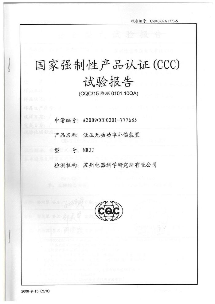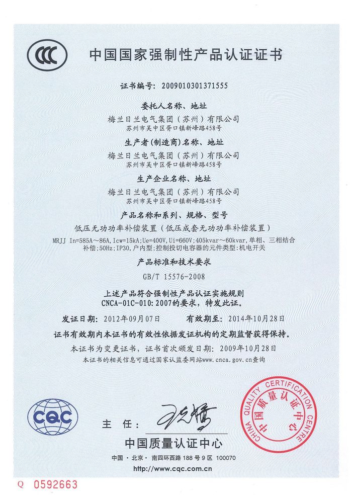 (成套)MRJJ無(wú)功柜資質(zhì)證書