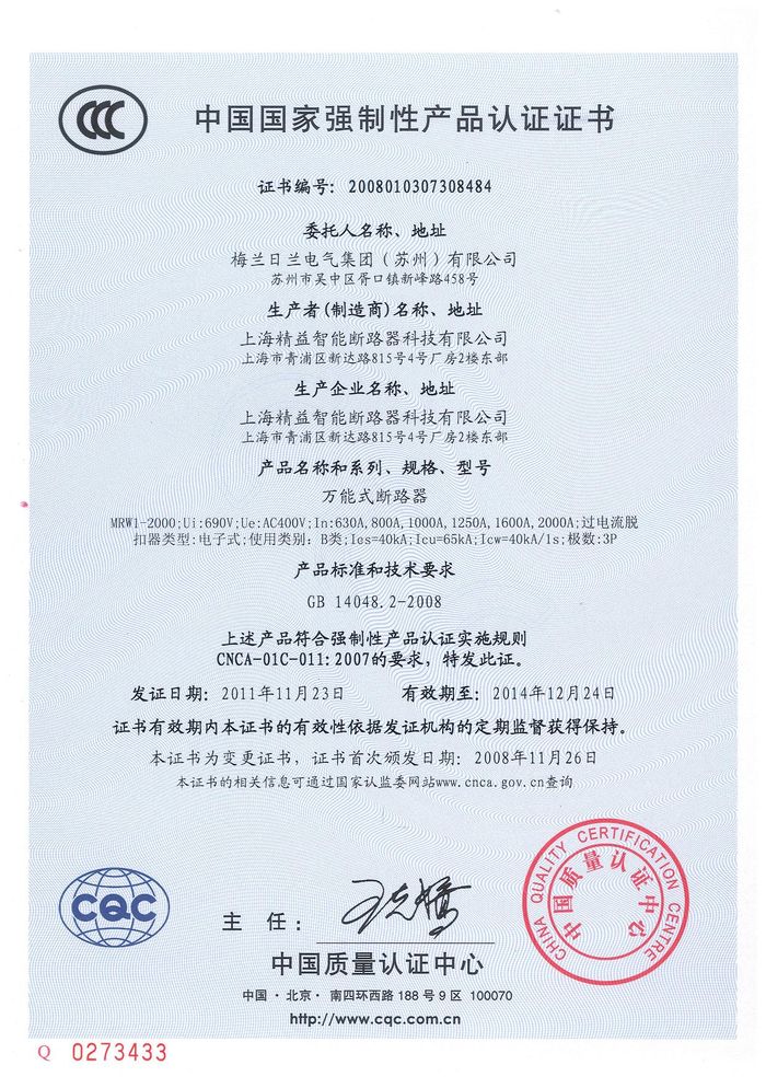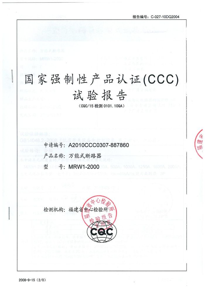 MRW1-2000萬(wàn)能斷路器資質(zhì)證書