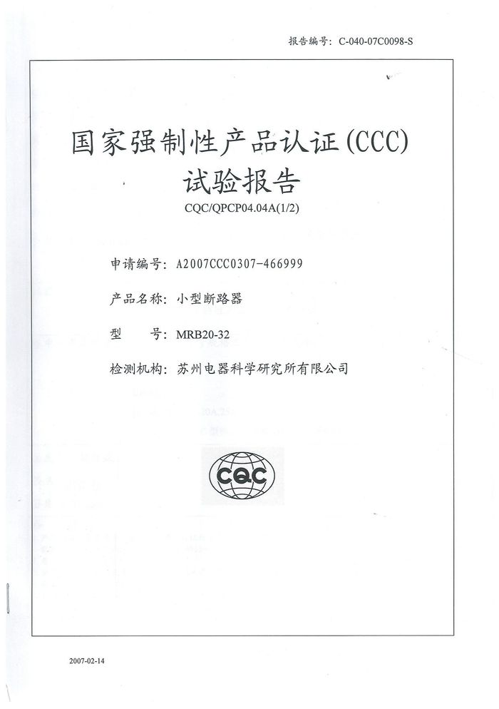 MRB20-32小型斷路器資質(zhì)證書