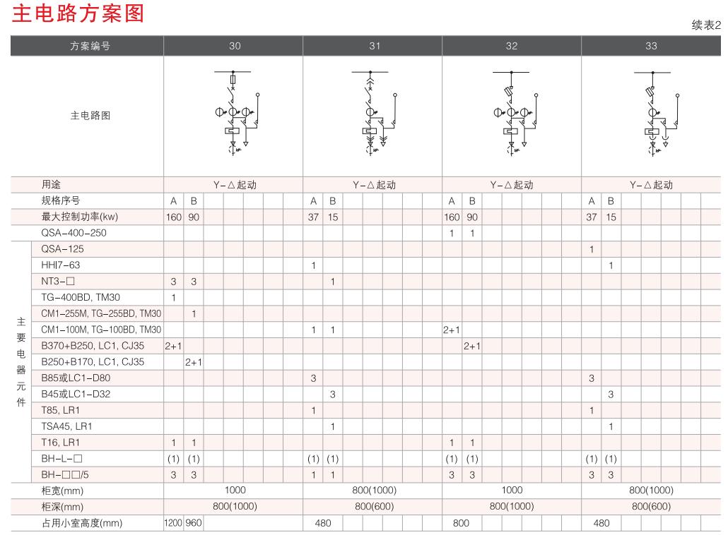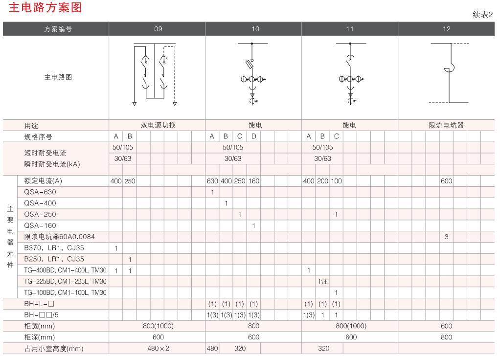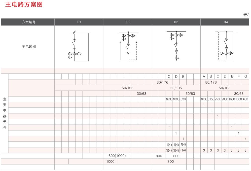 開關(guān)設(shè)備主電路方案共32組118個規(guī)格(見表2).不包括由于輔助電路的控制與保護的變化而派生的方案和規(guī)格。包括了發(fā)電、供用電和其它電力用戶的需要,額定工作電流為4000A,適合2500kVA及以下的配電變壓器選用。